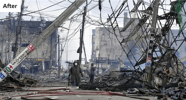 He also said some 3,000 rescuers were trying to reach parts of the Noto peninsula. Helicopter surveys showed many fires and widespread damage to buildings and infrastructure. The city of Wajima, on the northern tip of Noto, has been cut off from land routes.